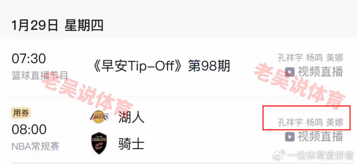 杨鸣刚离队就要担任解说嘉宾了,在1月29号迎来首秀,他将搭档美娜孔祥宇解说NBA常规赛湖人和骑士男篮的比赛。